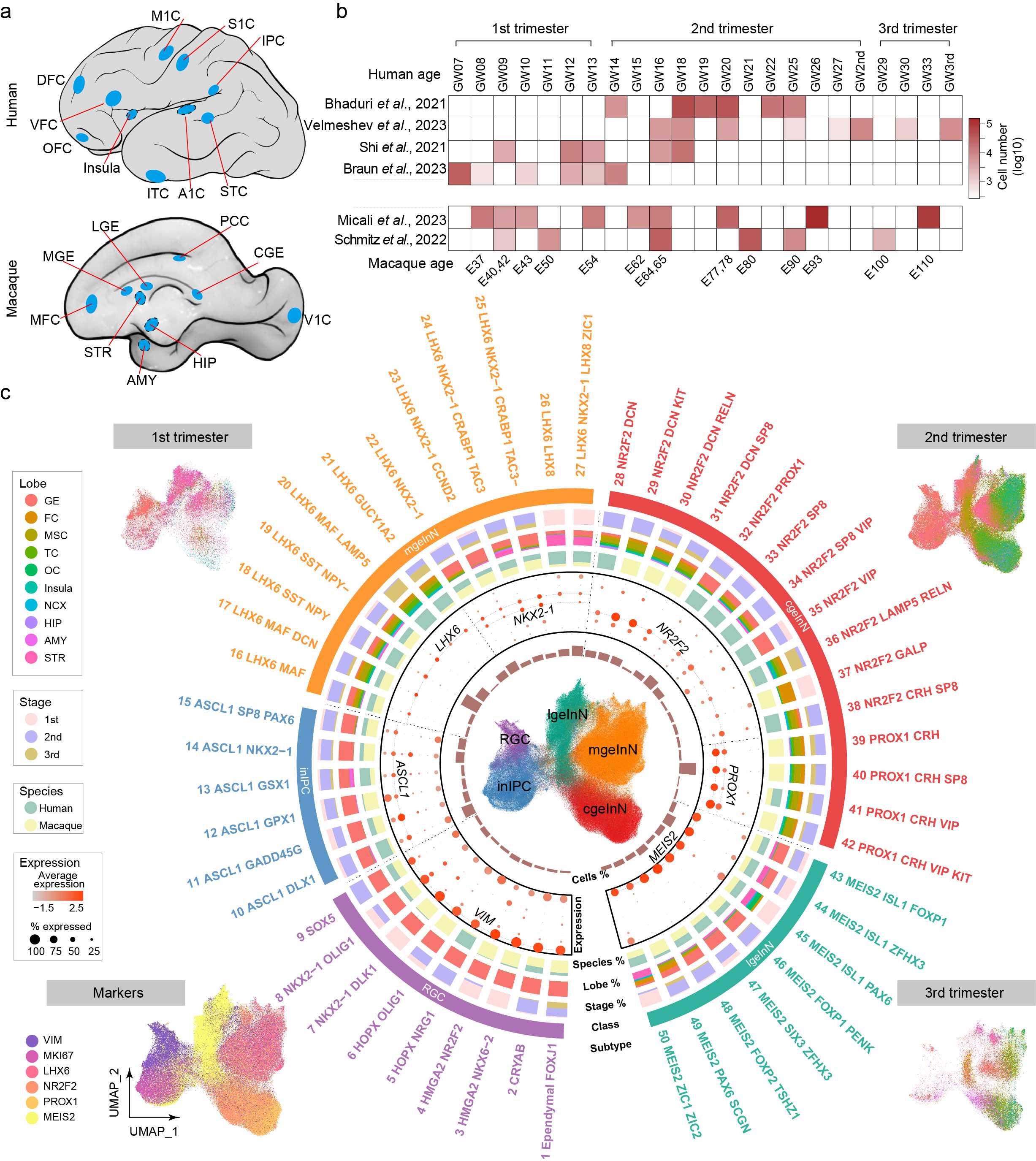 Cortical interneurons generated from ganglionic eminence via a long-distance journey of tangential migration display evident cellular and molecular differences across brain regions, which seeds the heterogeneous cortical circuitry in primates. However, whether such regional specifications in interneurons are intrinsically encoded or gained through interactions with the local milieu remains elusive. Here, we recruit 685,692 interneurons from cerebral cortex and subcortex including ganglionic eminence within the developing human and macaque species. Our integrative and comparative analyses reveal that less transcriptomic alteration is accompanied by interneuron migration within the ganglionic eminence subdivisions, in contrast to the dramatic changes observed in cortical tangential migration, which mostly characterize the transcriptomic specification for different destinations and for species divergence. Moreover, the in-depth survey of temporal regulation illustrates species differences in the developmental dynamics of cell types, e.g., the employment of CRH in primate interneurons during late-fetal stage distinguishes from their postnatal emergence in mice, and our entropy quantifications manifest the interneuron diversities gradually increase along the developmental ages in human and macaque cerebral cortices. Overall, our analyses depict the spatiotemporal features appended to cortical interneurons, providing a new proxy for understanding the relationship between cellular diversity and functional progression.