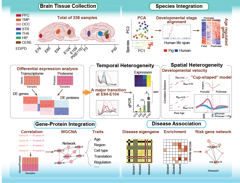 The perinatal period witnesses dynamic structural reorganization and functional specialization essential for establishing later-life neural circuitry integrity. However, molecular mechanisms governing spatiotemporal developmental trajectories during this critical window remain poorly characterized due to limited accessibility of human perinatal specimens. Here, we analysed transcriptomes and proteomes from 336 samples across multiple time points and brain regions in perinatal Bama miniature pigs, showing their spatiotemporal organization and concordance between genes and proteins. We characterized pigs as optimal large-animal model, demonstrating its closer analogy to humans, resemblance to monkeys, and superiority over the mice and other species, while identifying their perinatal stage as a transitional hub bridging early prenatal to postnatal molecular trajectories in humans. We revealed a pan-regional developmental inflection point (E94-E104) during the perinatal period, manifesting as order-of-magnitude changes in the expression of genes and proteins associated with synaptogenesis and gliogenesis. While further analysing developmental velocities across pig brain regions, we discovered regional heterogeneity exhibits a remarkably synchronized rise-and-fall pattern during the perinatal period. Additionally, brain disorder risk genes exhibited a perinatal transition to an adult-like organization in pigs, establishing this multi-omics atlas as a translational framework for decoding neurodevelopmental disorder pathogenesis.