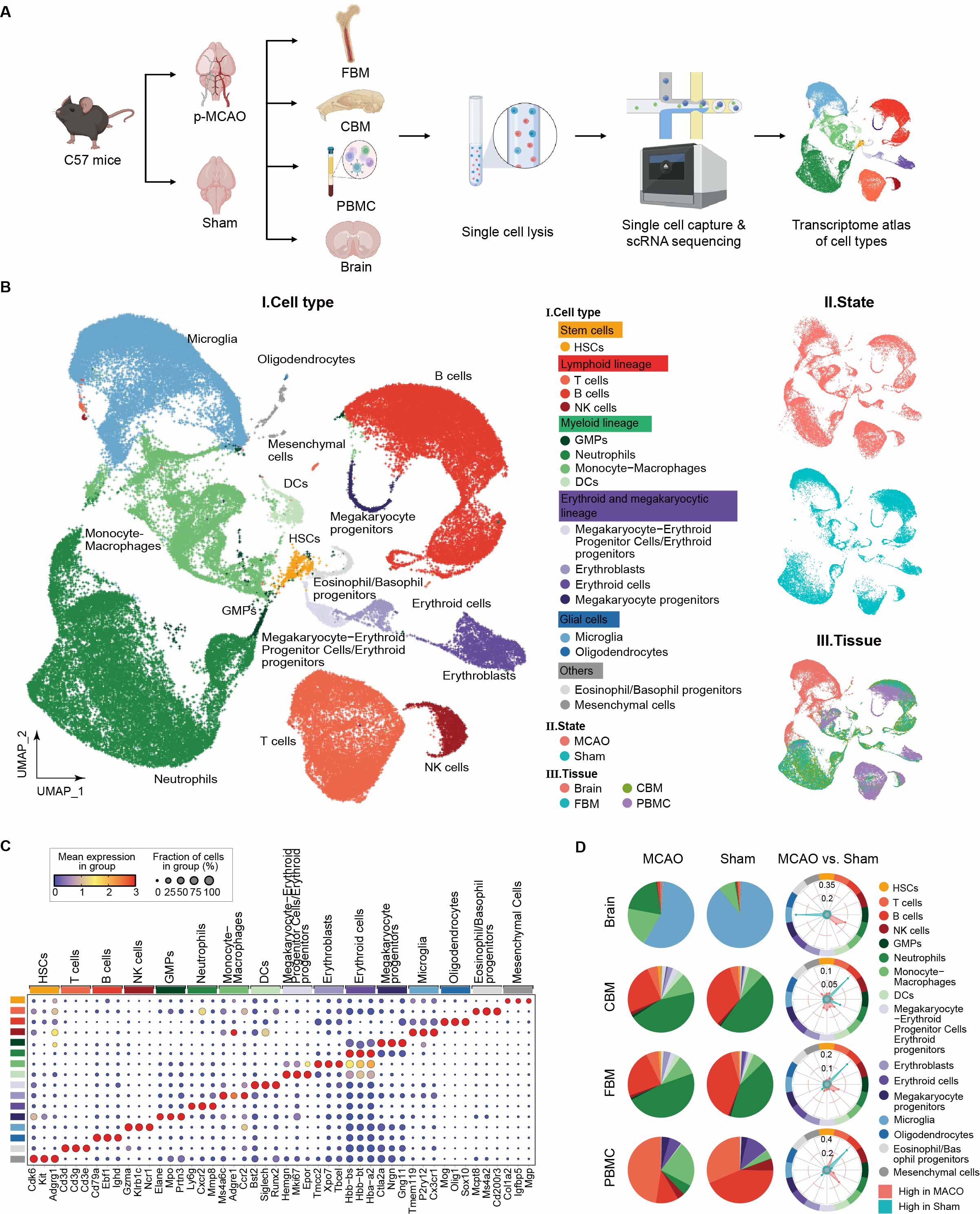 The activation and infiltration of immune cells are hallmarks of ischemic stroke. However, the precise origins and the molecular alterations of these infiltrating cells post-stroke remain poorly characterized. Here, a murine model of stroke (permanent middle cerebral artery occlusion [p-MCAO]) is utilized to profile single-cell transcriptomes of immune cells in the brain and their potential origins, including the calvarial bone marrow (CBM), femur bone marrow (FBM), and peripheral blood mononuclear cells (PBMCs). This analysis reveals transcriptomically distinct populations of cerebral myeloid cells and brain-resident immune cells after stroke. These include a novel CD14+ neutrophil subpopulation that transcriptomically resembles CBM neutrophils. Moreover, the sequential activation of transcription factor regulatory networks in neutrophils during stroke progression is delineated, many of which are unique to the CD14+ population and underlie their acquisition of chemotaxis and granule release capacities. Two distinct origins of post-stroke disease-related immune cell subtypes are also identified: disease inflammatory macrophages, likely deriving from circulating monocytes in the skull, and transcriptionally immature disease-associated microglia, possibly arising from pre-existing homeostatic microglia. Together, a comprehensive molecular survey of post-stroke immune responses is performed, encompassing both local and distant bone marrow sites and peripheral blood.